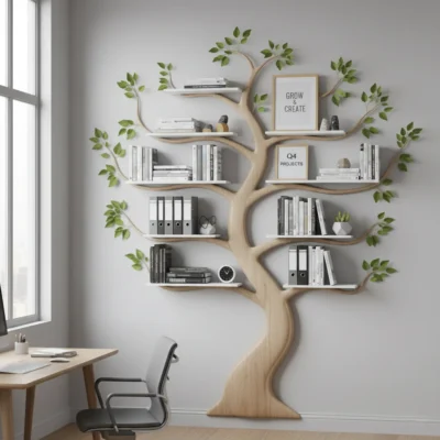 In a home office, the tree bookcase can help balance productivity with inspiration. Use the branches to sort professional books by topic or urgency. Blend in motivational quotes, small timers, a framed goal list, or desk accessories to create a space that’s both organized and energizing. Keep the design clean, but don’t be afraid to show a bit of personality.